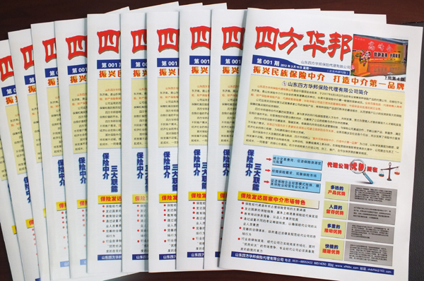 四方華邦保險(xiǎn)代理公司為宣傳企業(yè)文化、宣傳保險(xiǎn)知識(shí)和行業(yè)動(dòng)態(tài),為了更加及時(shí)、更加詳細(xì)的傳達(dá)保險(xiǎn)監(jiān)管方向和重點(diǎn),于2012年陸續(xù)刊印了企業(yè)內(nèi)部刊物《四方華邦展業(yè)手冊(cè)》和《四方華邦報(bào)》。兩種刊物涵蓋了行業(yè)監(jiān)管、公司介紹、公司文化、行業(yè)發(fā)展趨勢(shì)、保險(xiǎn)的意義與功用、業(yè)務(wù)人員榮譽(yù)榜、理賠知識(shí)、理賠案例、合作公司簡(jiǎn)介、產(chǎn)品推介等豐富內(nèi)容。