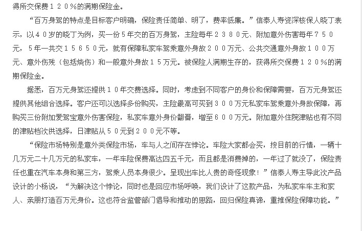 信泰人壽推出“百萬身駕”保險計劃