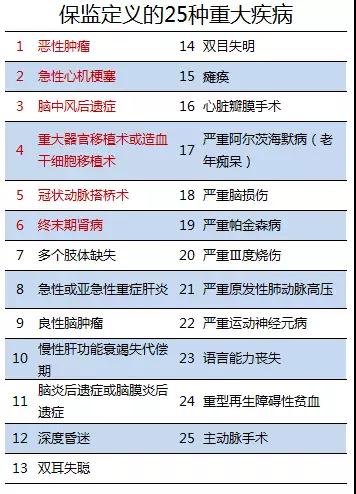 上述6大重疾是中國保險(xiǎn)行業(yè)協(xié)會與中國醫(yī)師協(xié)會的重疾定義,此外,行業(yè)重疾定義還規(guī)定了另外19種比較常見的重疾,這就組成了最常見的25種重疾組合,這是目前市場上絕大多數(shù)重疾產(chǎn)品提供的基本覆蓋范圍,對于99%的國人來講,遇到這25種重疾之外的其它重疾概率實(shí)在微乎其微。