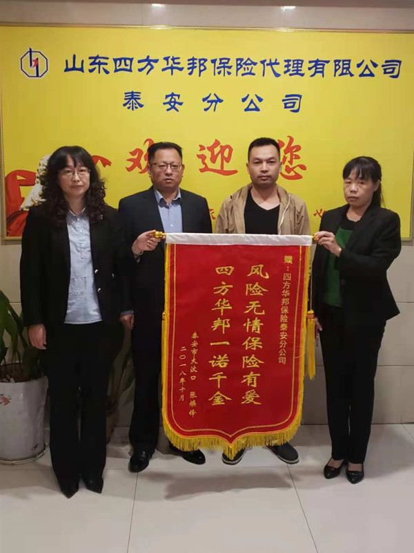 9月27日其家人將最后一份所需資料遞交給承保公司,9月28日客戶的家人就收到了保險公司的理賠款20萬元??蛻艏胰耸盏嚼碣r款后一直在夸我們公司的業(yè)務(wù)員和理賠服務(wù)人員專業(yè),出險后不用操心就能很快的收到理賠款,此客戶在其他保險公司也有辦理的保險,出險后明顯的不如我們代理公司服務(wù)好,時效快??蛻艏胰藢τ诶碣r特別滿意,今天特地趕到公司給公司送來了錦旗:風(fēng)險無情保險有愛,四方華邦一諾千金!
