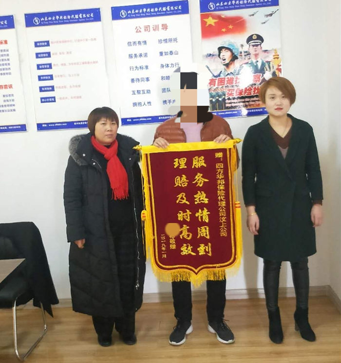 通過本次理賠,原來還持懷疑態(tài)度的張先生真正相信了保險(xiǎn),今天張先生特此為我司送來錦旗以示感謝!近日,張先生又在我司為其家人購買了多份保險(xiǎn)產(chǎn)品。