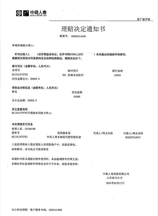 客戶去世時正是2021年年三十凌晨,家人悲痛之余處理了后事。泰安分公司侯燕紅經(jīng)理協(xié)助客戶理賠資料整理后遞交,中荷人壽在3月17日收到理賠資料后于下午2:10錄入初審系統(tǒng),快速開展理賠程序,當天晚上7:20系統(tǒng)結案處理完畢,按合同約定賠付其家人60000元。