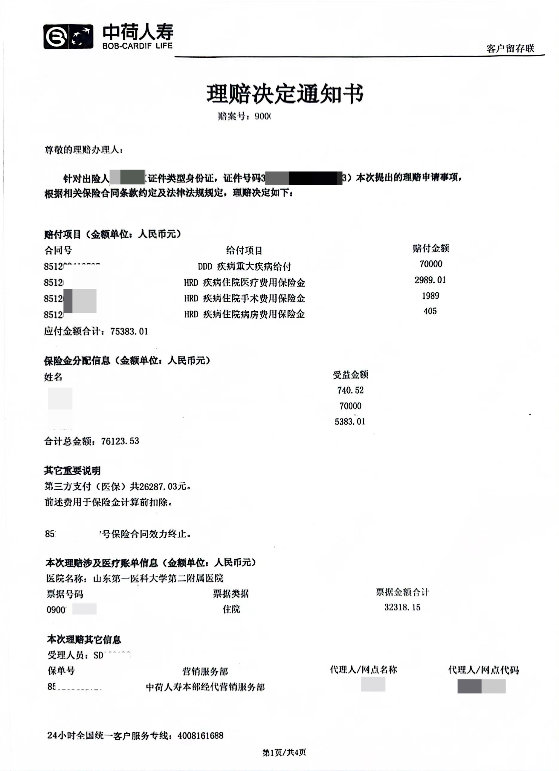 非常不幸的是,王女士在2024年五月份查體的時(shí)候確診為肺癌,住院切除了一葉肺,住院職工醫(yī)保報(bào)銷后自費(fèi)6000多元??蛻舫鲈汉筇峤涣死碣r申請(qǐng),中荷人壽按合同約定賠付了76123.53元;信泰人壽按合同約定賠付了10萬(wàn),并豁免了后續(xù)14期保費(fèi)52780元,合同繼續(xù)有效。