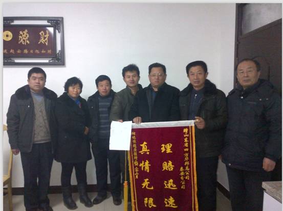 李女士于2012年11月份因肺癌病逝于家中。李女士的家人將資料準(zhǔn)備齊全后,于2012年11月27日交給保險公司。保險公司經(jīng)調(diào)查無疑后,于2012年12月24日結(jié)案,給予理賠5.3萬元。李女士的家人對我們的服務(wù)非常滿意。他們?yōu)楸硎靖兄x,于2012年12月28日給我們公司送來了一面錦旗