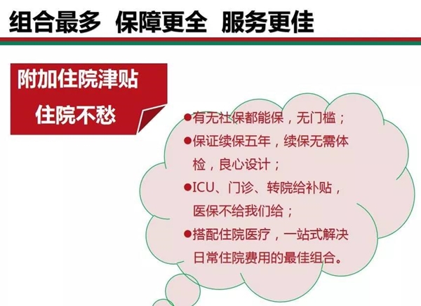 2、還可附加投保人重疾身故豁免、新住院津貼(含ICU特殊津貼、轉(zhuǎn)院津貼)、住院醫(yī)療(醫(yī)保內(nèi)外均可報(bào)銷(xiāo))、意外身故、意外醫(yī)療 保障超全。