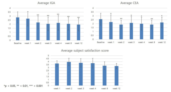 受試者的平均 IGA 評(píng)分從第 2 周開(kāi)始下降,并持續(xù)下降至第 12 周。受試者的平均 CEA 評(píng)分也展現(xiàn)出相同的趨勢(shì),從第一次外泌體應(yīng)用后的第一周開(kāi)始下降。