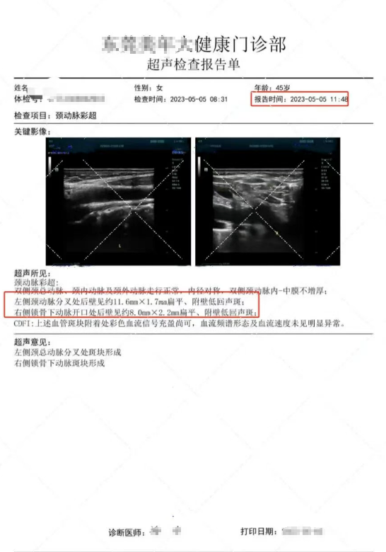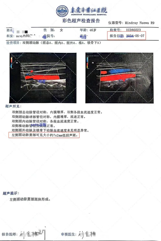 東莞某女士,45歲,2023年5月5日體檢彩超結(jié)果顯示,左側(cè)頸動脈分叉處后壁見約11.6mmx1.7mm扁平、附壁低回聲;右側(cè)鎖骨下動脈開口處后壁見約8.0mmx2.2mm扁平、附壁低回聲斑。左側(cè)頸總動脈分叉處斑塊形成,右側(cè)鎖骨下動脈斑塊形成。