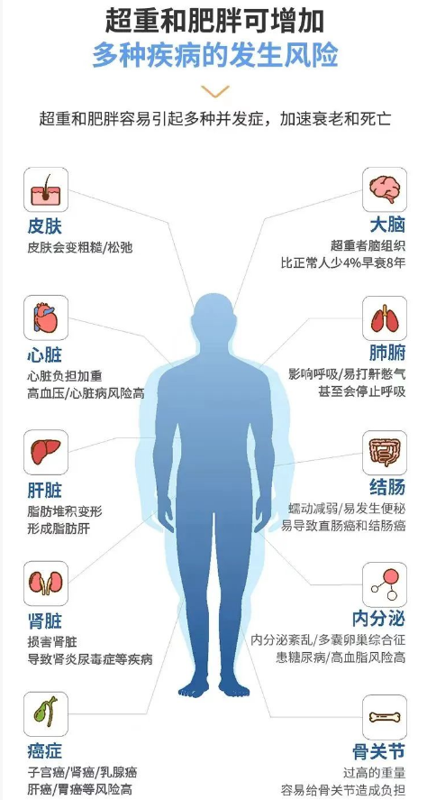 許多研究表明,超重和肥胖與許多疾病有著密切關(guān)系,比如高血壓、糖尿病、高血脂、心腦血管疾病以及部分癌癥等。