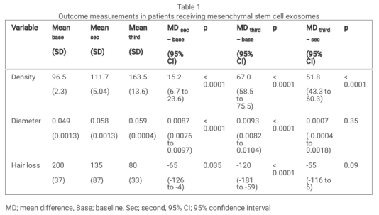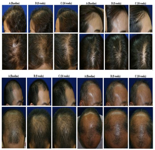12名雄激素性脫發(fā)患者(男性7名,女性5名),年齡18-60歲,脫發(fā)等級(jí)為男性Norwood III-IV級(jí)或女性Ludwig I-II級(jí)。接受胎盤(pán)干細(xì)胞外泌體的臨床研究,每14天一次,最多4次。