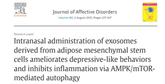 2025年4月,國內(nèi)一研究團(tuán)隊(duì)在國際知名期刊《情感障礙雜志》上發(fā)表了一項(xiàng)令人振奮的研究成果,發(fā)現(xiàn)通過鼻腔給予脂肪間充質(zhì)干細(xì)胞(ADSC)來源的外泌體,能夠改善抑郁樣行為并抑制炎癥反應(yīng)。