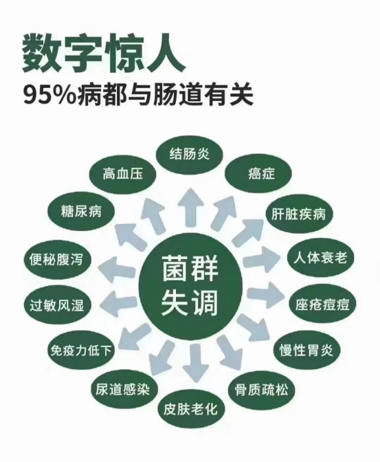 人體腸道內(nèi)重達(dá)1.5公斤、數(shù)以百億計的微生物,構(gòu)成了關(guān)鍵的微生態(tài)系統(tǒng)——掌管著免疫調(diào)節(jié)、營養(yǎng)吸收、防癌抗癌等重任。腸道菌群失調(diào)、腸黏膜損傷是多種疾病的“導(dǎo)火索”,包括阿爾茨海默癥、帕金森病、焦慮抑郁、失眠,乃至肝膿腫、腸癌等。 現(xiàn)代醫(yī)學(xué)發(fā)現(xiàn),80%-90%的慢性病發(fā)生發(fā)展都與腸道菌群失衡相關(guān).
