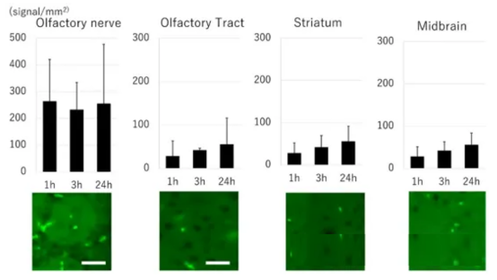 結(jié)論:鼻腔移植外泌體在嗅神經(jīng)、嗅球、紋狀體和中腦廣泛分布,大量外泌體信號(約 250 個信號/mm2)可以在移植后 1 小時開始在嗅神經(jīng)中找到;在嗅道、紋狀體和中腦中陽性信號明顯,并且這些區(qū)域的信號在移植后 24 小時內(nèi)逐漸增加。
