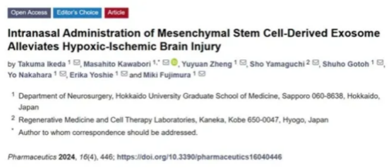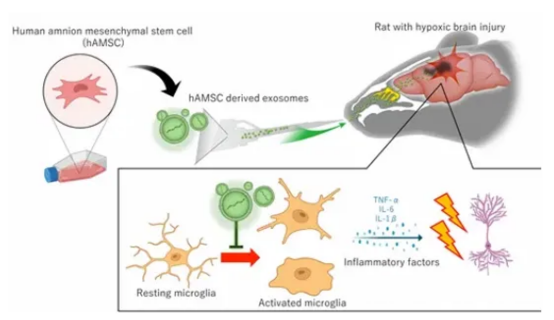 針對缺血缺氧性腦病,鼻內(nèi)給藥干細(xì)胞外泌體成為許多研究者的選擇。日本學(xué)者通過動物模型實(shí)驗(yàn)發(fā)表研究結(jié)果:源自間充質(zhì)干細(xì)胞的鼻內(nèi)移植外泌體,最早可在 1 小時遷移到大腦中,并在移植后 24 h 內(nèi)持續(xù)增加,并成功減輕小膠質(zhì)細(xì)胞炎癥和神經(jīng)損傷,從而恢復(fù)認(rèn)知功能。