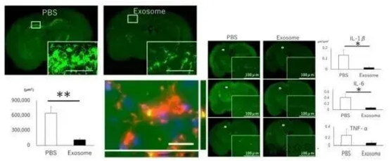 結(jié)論:PBS 組活化小膠質(zhì)細(xì)胞現(xiàn)象明顯,外泌體處理組則顯著減輕。外泌體與小膠質(zhì)細(xì)胞共定位,顯示其抗炎作用。