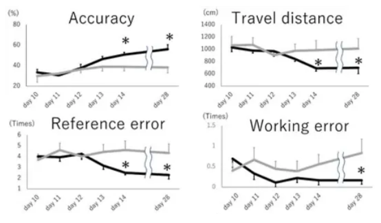 結(jié)論:接受鼻內(nèi)外泌體的動物在準(zhǔn)確性、行進(jìn)距離、參考錯誤和工作錯誤等方面表現(xiàn)出更好的記憶功能。