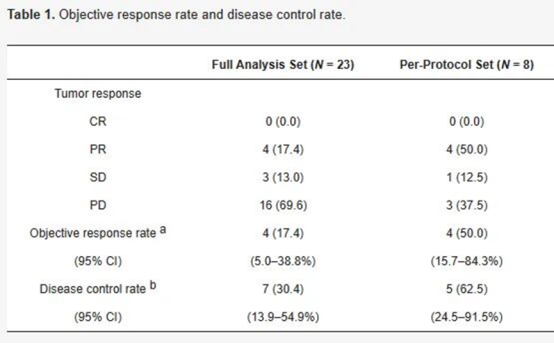 經(jīng)過三個(gè)周期治療后,數(shù)據(jù)顯示:第一階段,6名患者中的4名(66.7%)共發(fā)生7次不良事件,但無嚴(yán)重不良事件報(bào)告。進(jìn)入第2a期,29名受試者(占85.3%)累計(jì)出現(xiàn)126起不良事件。整體來看,總緩解率(ORR)為17.4%,聯(lián)合方案的ORR均值則達(dá)到50.0%。