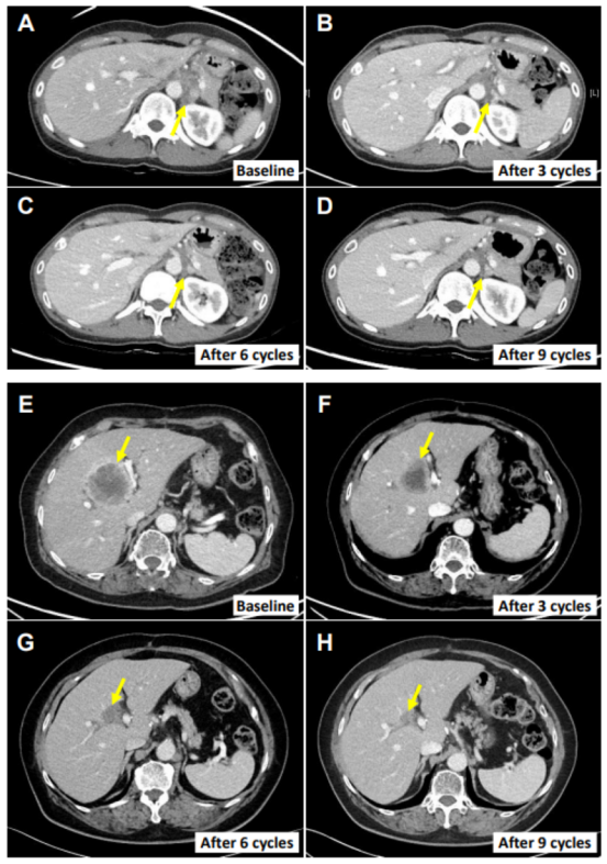 值得注意的是,患者E0107為一例40歲女性,因膽囊炎行膽囊切除術(shù),術(shù)后病理確診為膽囊癌合并腹膜癌。其病史中已包含使用吉西他濱、順鉑、5-氟尿嘧啶(5-FU)、伊立替康脂質(zhì)體及亞葉酸等多種化療藥物的治療經(jīng)歷。在采用NK細(xì)胞療法聯(lián)合帕博利珠單抗治療后,其轉(zhuǎn)移性淋巴結(jié)體積顯著縮小,減小幅度高達(dá)82.3%。