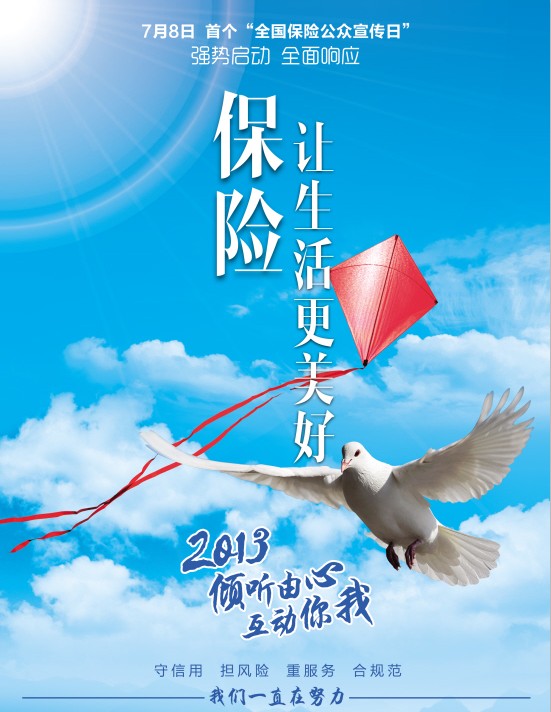 中國(guó)保監(jiān)會(huì)6月8日發(fā)布消息稱,將每年的7月8日確定為"全國(guó)保險(xiǎn)公眾宣傳日",主題是"保險(xiǎn),讓生活更美好"。每年還將確定不同的年度宣傳主題,在全國(guó)進(jìn)行宣傳,今年的年度主題是"傾聽由心、互動(dòng)你我"。保監(jiān)會(huì)將開通官方微博、微信帳號(hào),促進(jìn)宣傳日推廣。