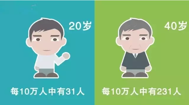 根據(jù)2015年的數(shù)據(jù)顯示,惡性腫瘤的發(fā)病率在0到34歲處于較低水平,40歲以后開(kāi)始快速升高。上圖為某一線城市癌癥發(fā)病率數(shù)據(jù),40歲是20歲的7.45倍。