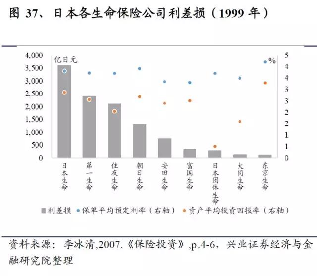 大量的高預定利率產(chǎn)品嚴重增加了壽險公司的資產(chǎn)端壓力,即使后來保險公司預定利率多次下調(diào),在1997-2000年期間,日本大多數(shù)壽險公司仍然出現(xiàn)了資產(chǎn)平均回報率不及預定利率的情況,從而遭受巨額利差損。截止1999年,日本主要壽險公司平均預定利率仍維持在3%-4.2%,而資產(chǎn)平均收益率卻維持在0.5%-3.3%。