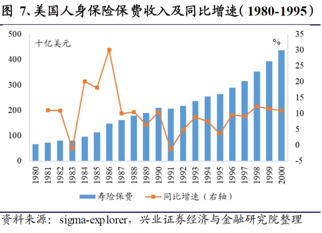 利率市場化的進程中,壽險業(yè)也有了同步的保險費率市場化改革。此外,80年代初,美國對原有的私人企業(yè)退休金制度進行了改革,企業(yè)與員工共同繳費,并由所繳費用投資回報來負擔員工退休福利,促進了員工投資需求。這一時期,為了吸引更多客戶,美國各大保險公司推出了存取靈活的通用型壽險和注重回報的投資型壽險。在多種因素作用下,美國壽險業(yè)實現(xiàn)快速發(fā)展。