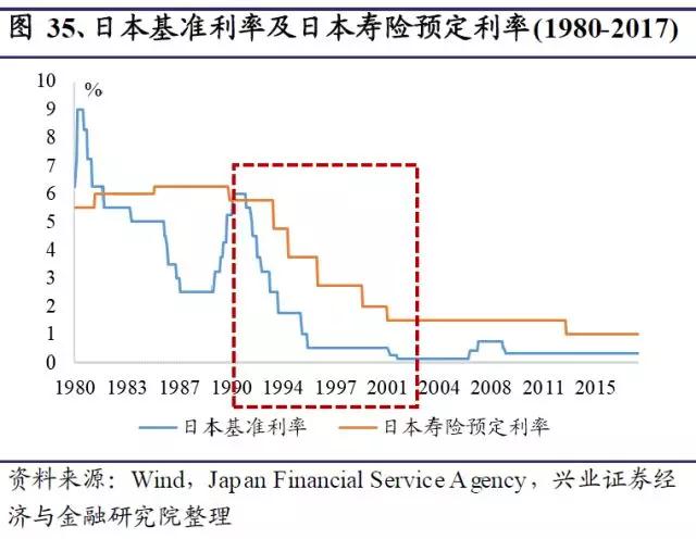 泡沫經(jīng)濟時代,日本壽險公司為了搶占市場份額,增加保費收入,銷售了大量高預定利率、儲蓄性強的養(yǎng)老保險和個人年金。隨著經(jīng)濟泡沫的破滅,自1991年起,日本便不斷下調(diào)基準利率,壽險公司的預定利率也從1990年的6%以上,逐漸下調(diào)至1999年的2%。